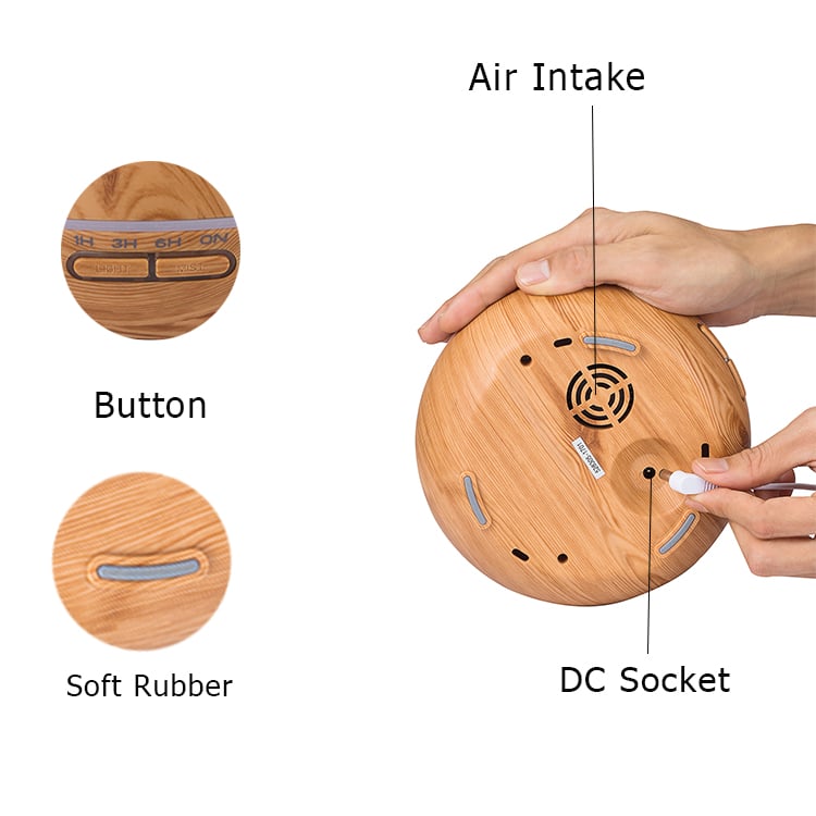 Fyrværkeri farvedesign: med et enkelt tryk kan du skifte mellem 7 flotte farver kontinuerligt som kan ligne fyrværkeri, du kan også vælge en af de 7 farver ved at klikke på venstre knap. Aromadiffuseren kan også anvendes uden lys og tåge funktion.