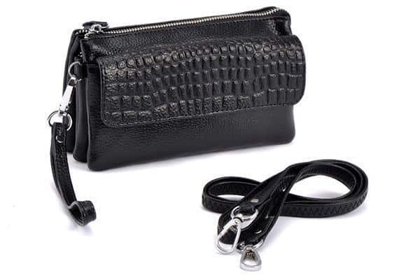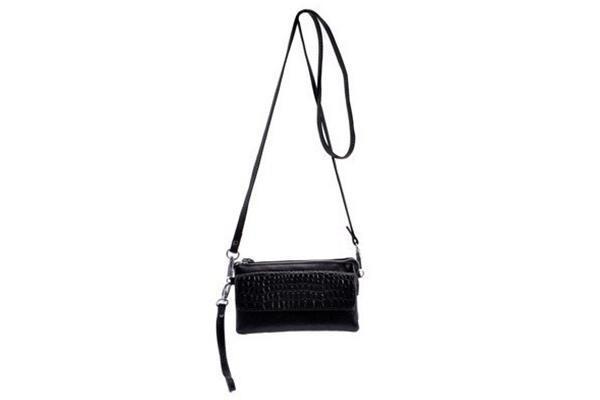 Virkelig flot og stilren clutch udført i imiteret læder og leveres i flere forskellige friske farver. Tasken lukkes med lynlås og har skulderrem. Tasken har et stort indvendigt rum med god plads til både mobil og kreditkort m.m. og et lille rum i midten der kan lukkes med lynlås. Tasken måler 17 x 10 cm.
