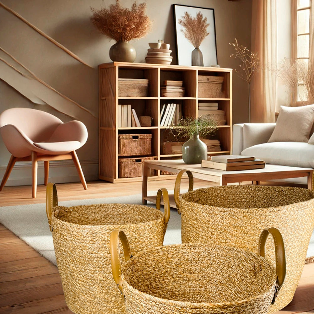 Dette sæt af fletkurve er både praktisk og dekorativt, hvilket gør dem ideelle til at holde orden i hjemmet. De tre kurve kommer i forskellige størrelser, perfekt til opbevaring af alt fra magasiner til tæpper. Hver kurv er omhyggeligt fremstillet med søgræs og bomuld, og de har kunstlæderhåndtag, der tilføjer et stilfuldt touch.
