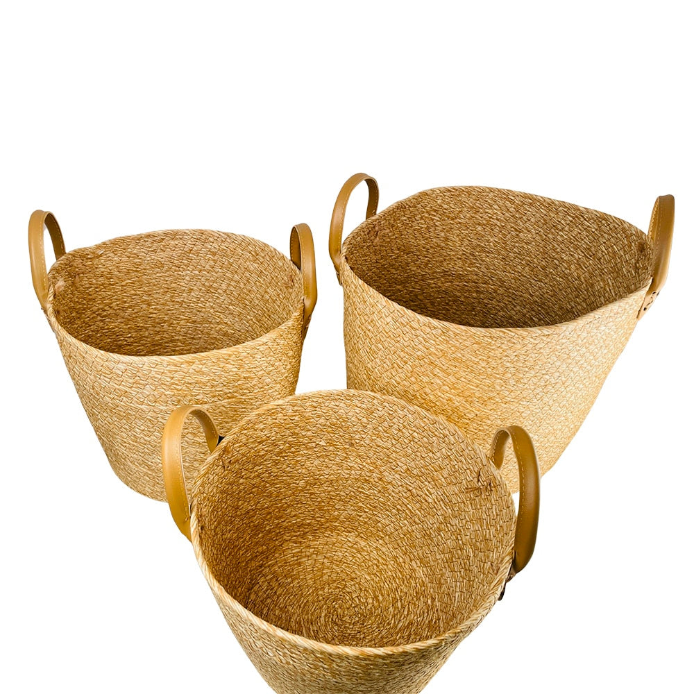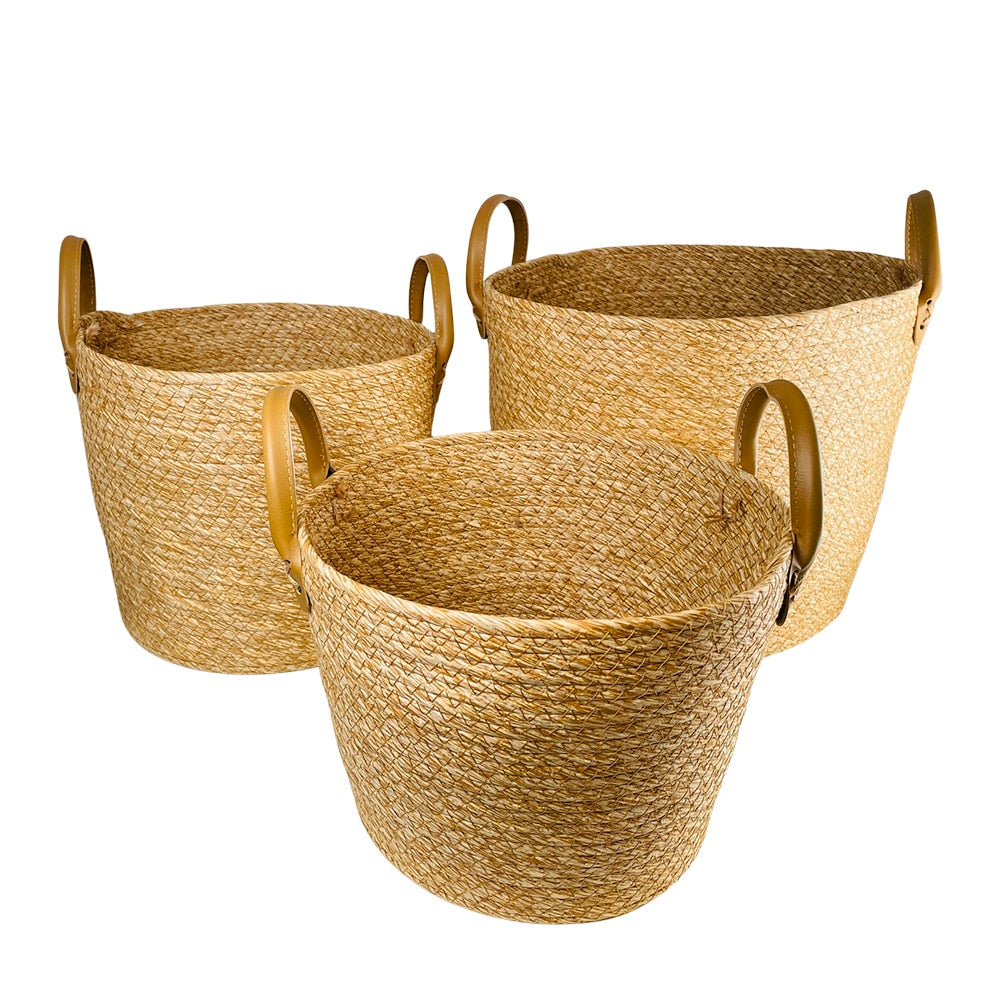 Fletkurve 3 stk. i søgræs med kunstlæder håndtag (diameter 31, 28 og 25 cm)