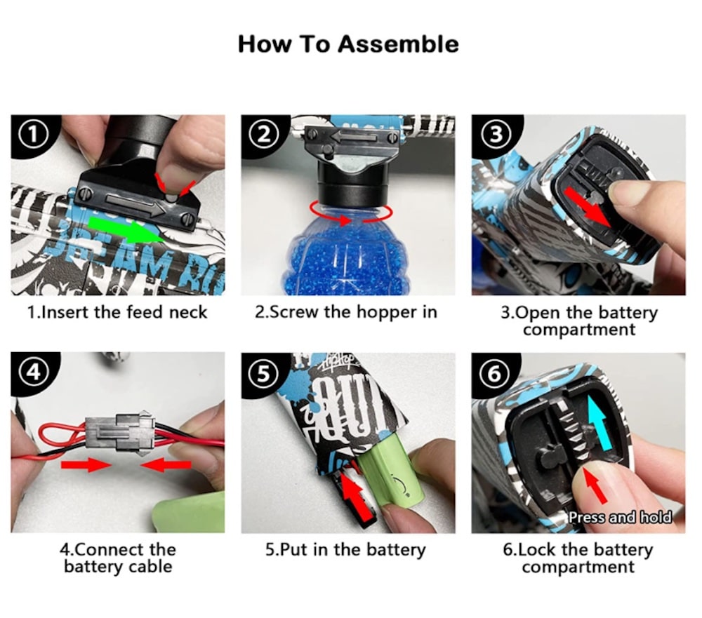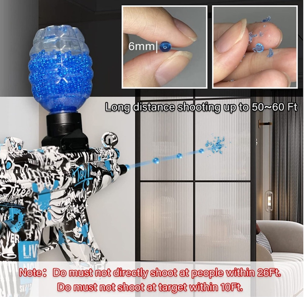 Før brug skal gelékuglerne lægges i vand ca. 2 timer (første 20 min. i varmt vand) som absorberes. Når kuglerne er klar er de ca. 7-8 mm og kan nu benyttes i pistolen. Gelékuglerne er vandbaserede perler der er 100% naturlige. Når perlerne knuses, siver der ikke vand ud af den, da perlen er en geléagtig substans som er biologisk nedbrydelig og fordamper helt af sig selv. Gelékuglerne må IKKE indtages.