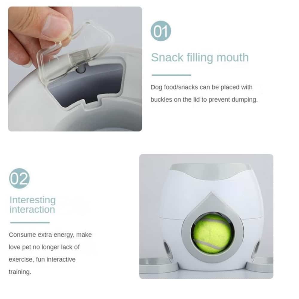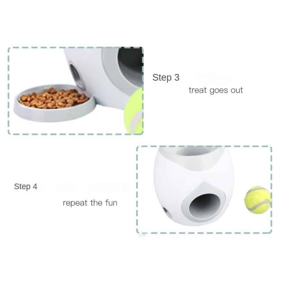 Er din hund vild med bolde? Så vil den helt sikkert elske denne godbid og bolddispenser der belønner din hund med lækre godbidder hver gang bolden returneres i dispenseren. Godbid og bolddispenseren virker lidt som en apport-leg. Din hund henter bolden, og når den placeres tilbage i dispenseren, falder der straks en lækker belønning. Herefter triller bolden ud af dispenseren igen.