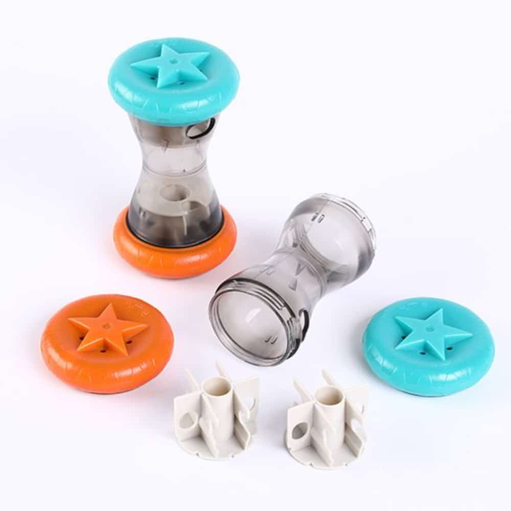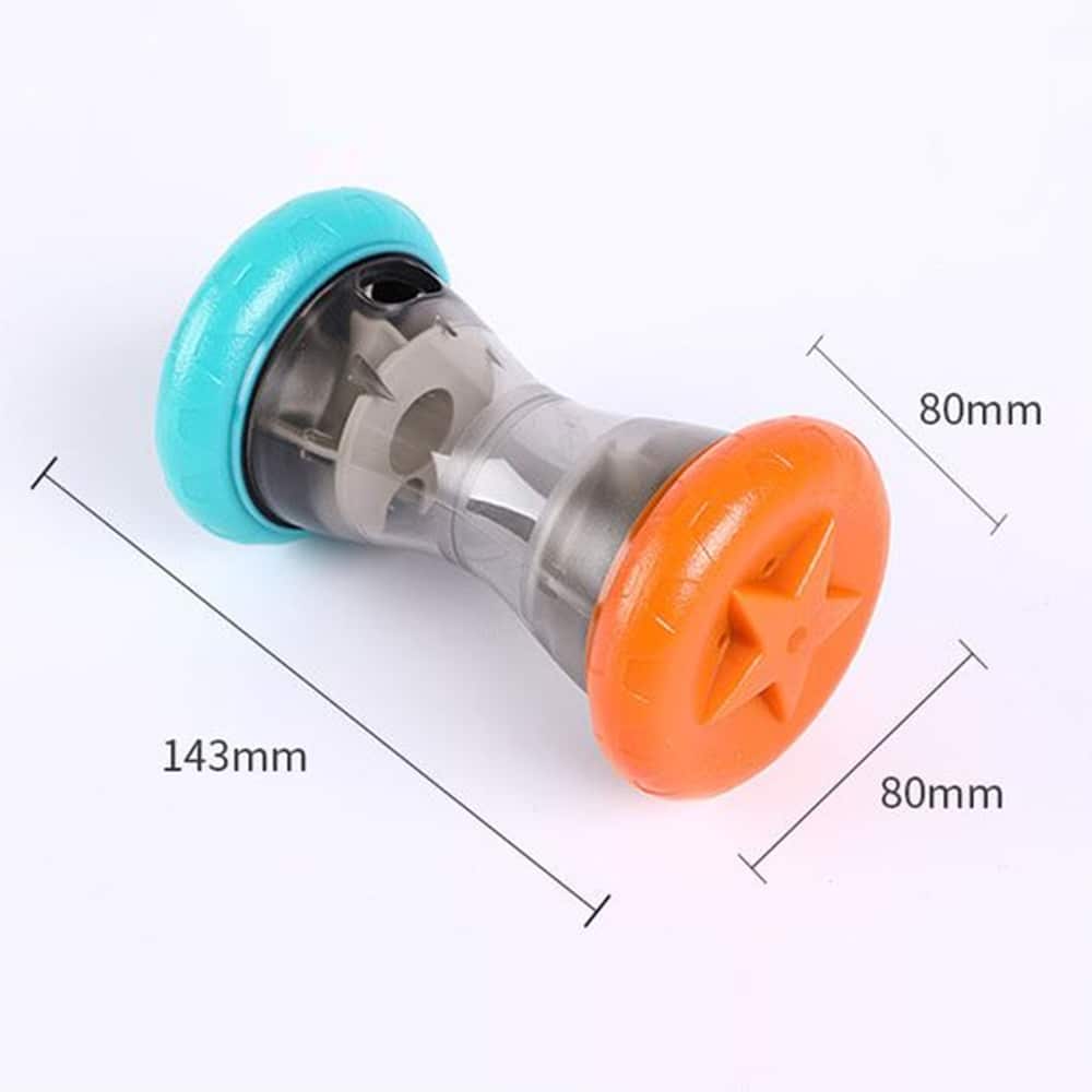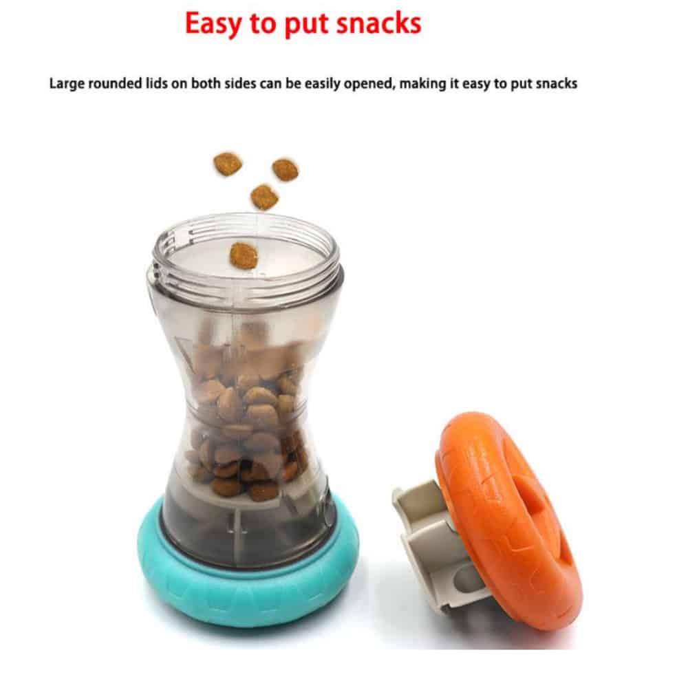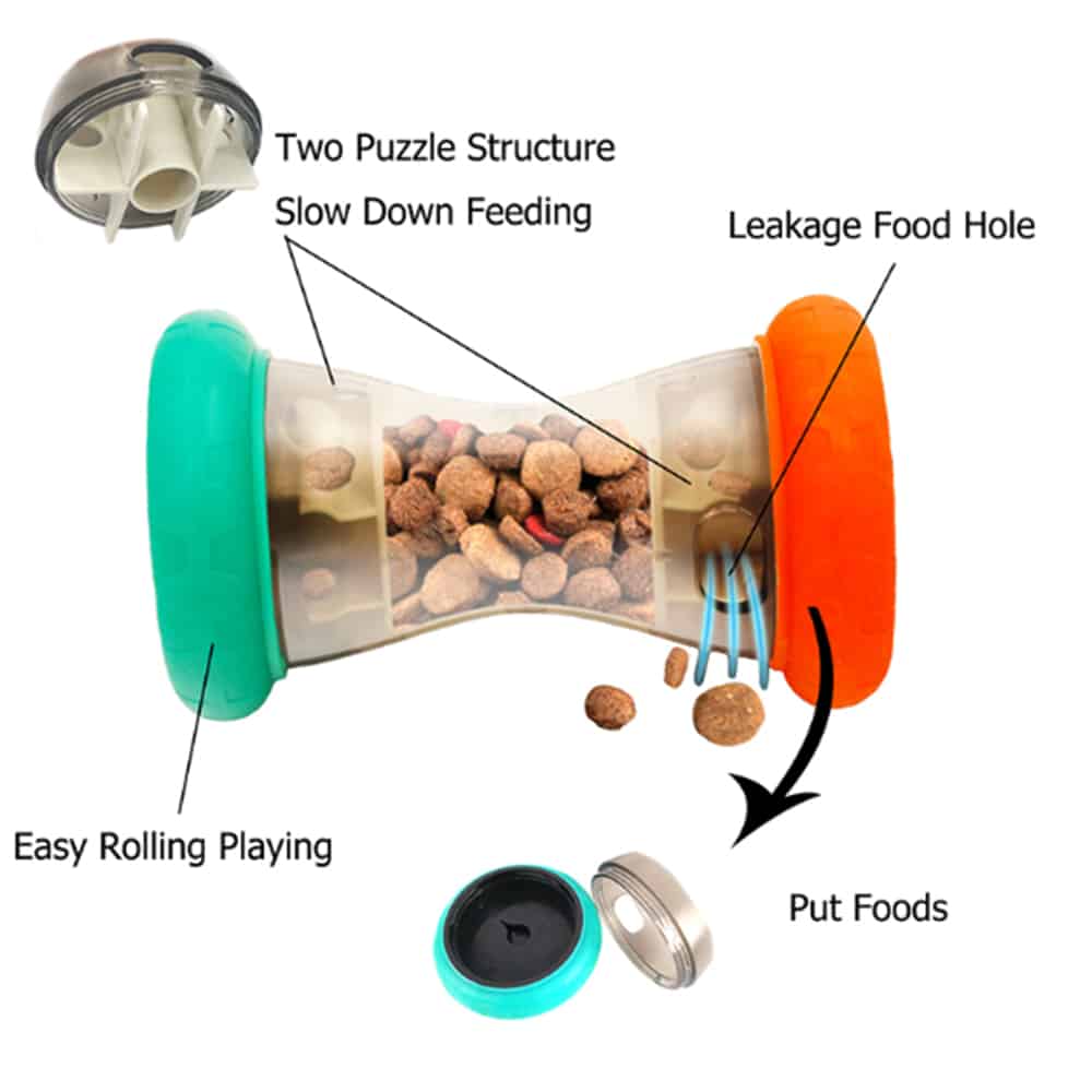 Hundelegetøjet er nemt at fylde igennem den stjerneformede åbning i toppen, så man kan bruge både små tørre snacks og tørfoder. Aktivitetslegetøjet har 2 åbninger, hvorfra lækkerierne triller ud fra under legen.