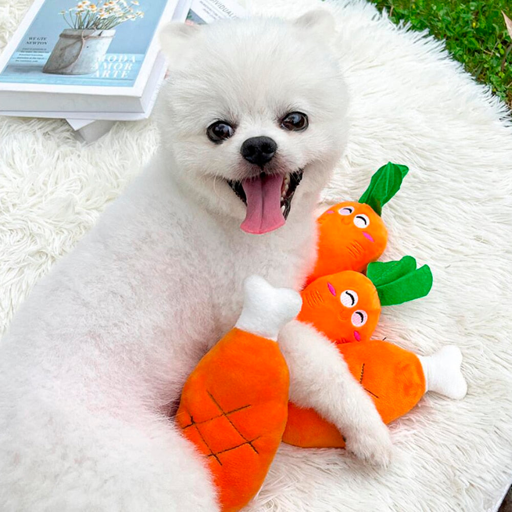 Hold din hund underholdt og aktiv med vores sjove interaktive tyggelegetøj! Vælg mellem de charmerende designs som gulerod eller kyllingben, begge med indbygget squeaker for ekstra leg og sjov.