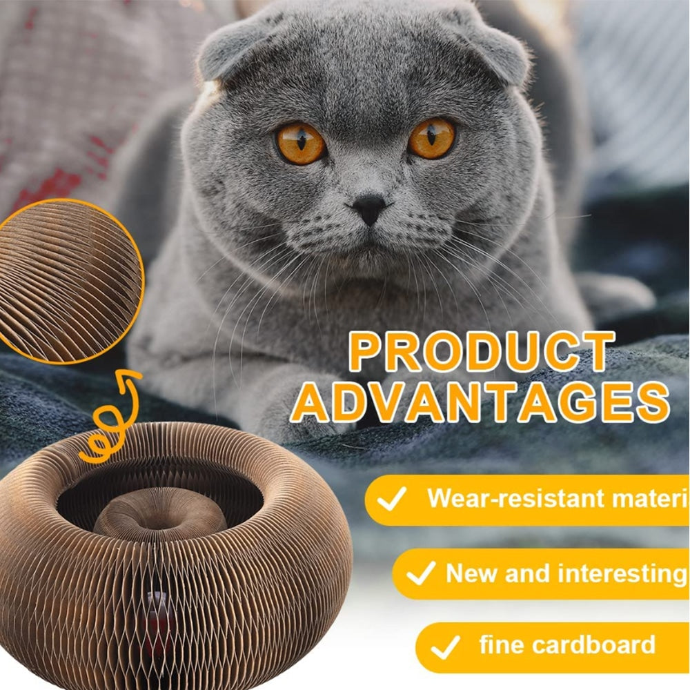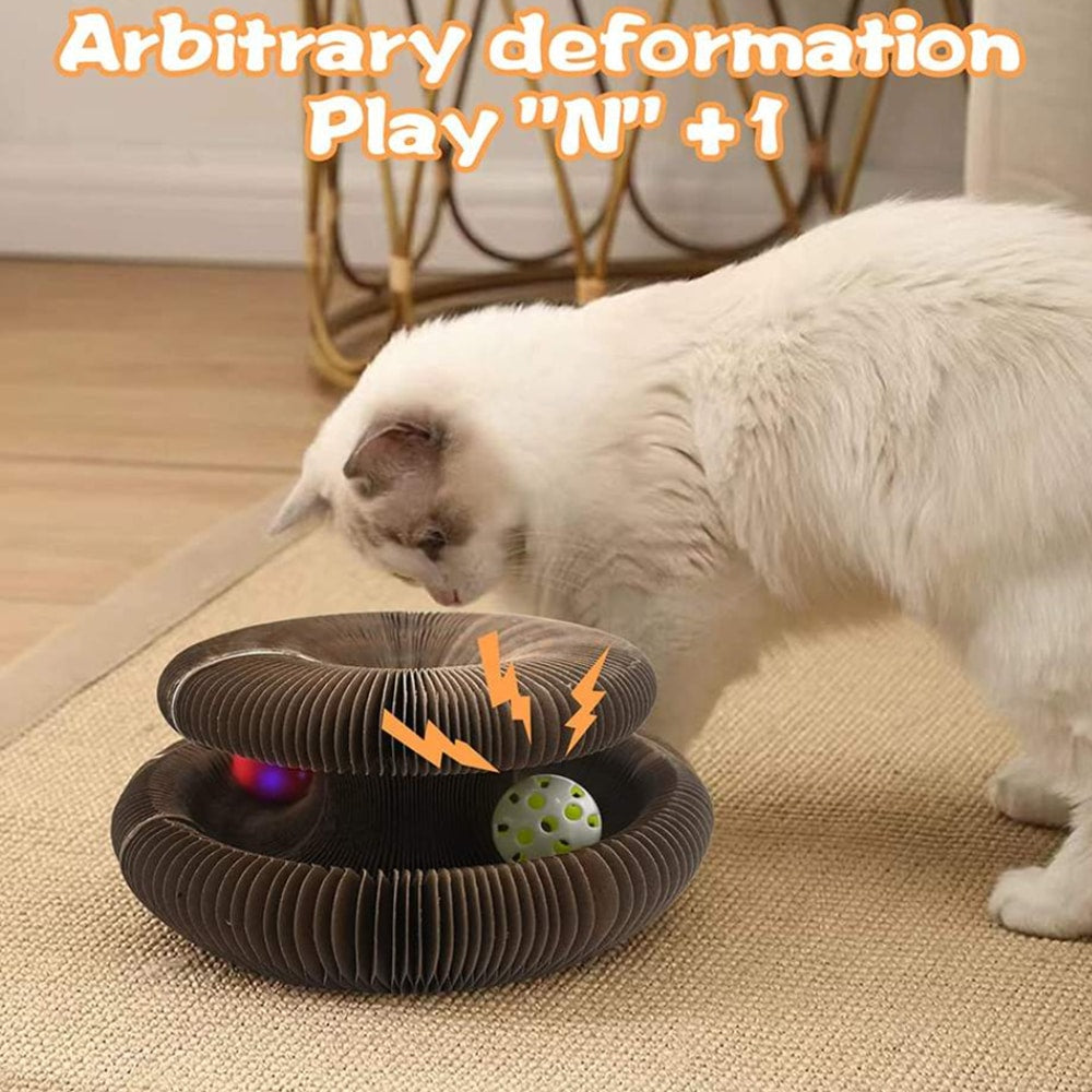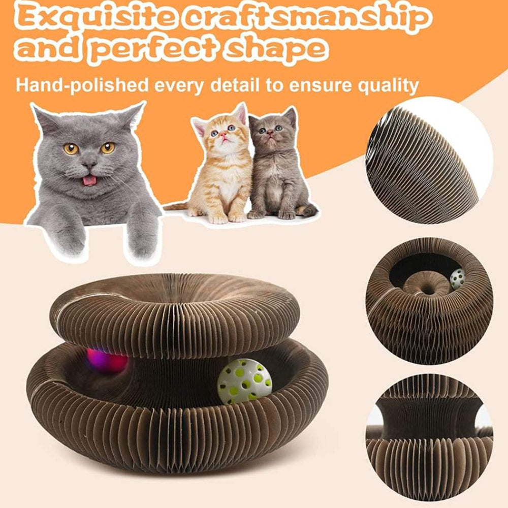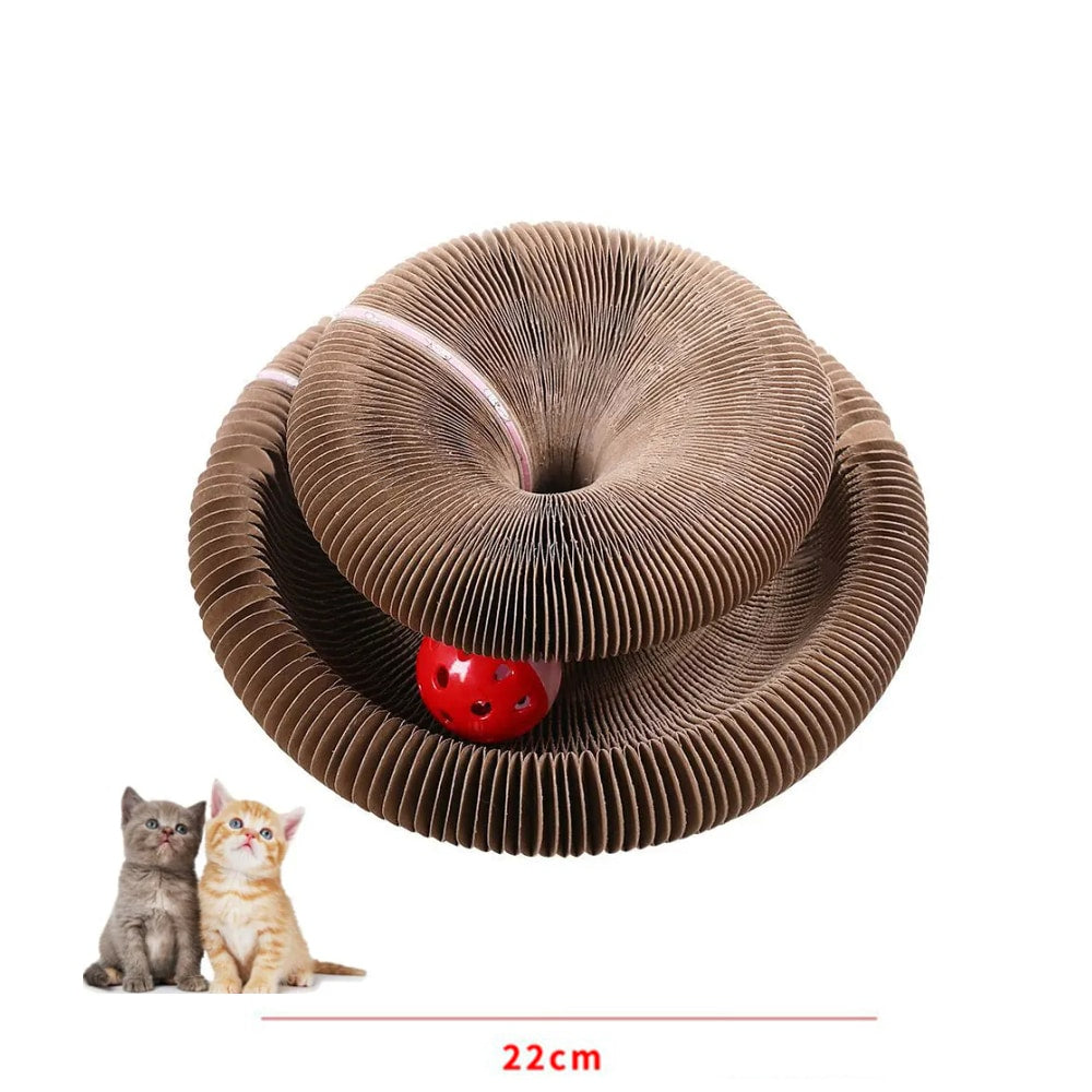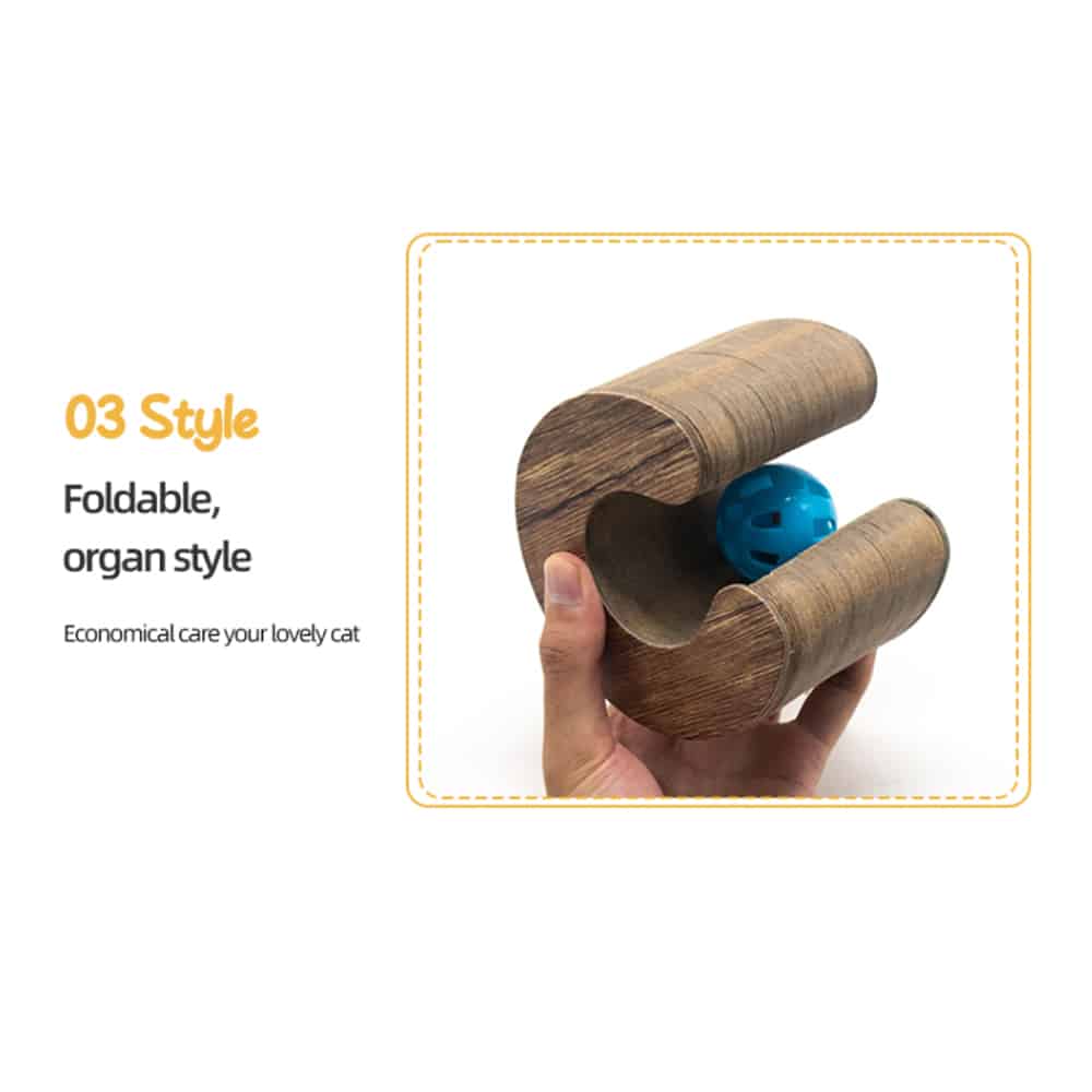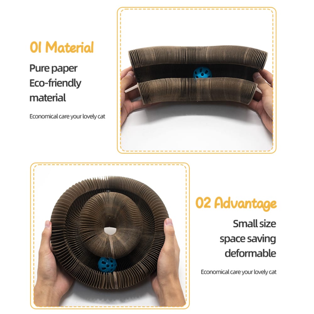 Undgå at få en ridset sofa, lænestol eller andet møbel når din kat vil slibe sine kløer - og samtidig sørg for at din kat har et sjovt og underholdende legetøj. Her får du et smart sammenklappelig og stærkt holdbart pap-kradselegetøj i et unikt design som passer perfekt til enhver boligindretning, med en bold som din kat uden tvivl vil elske at jage rundt med.