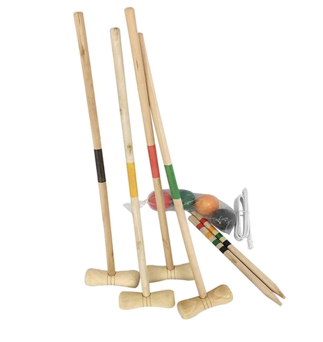 - indeholder: 4 køller 75 cm, 4 kugler ø7,3 cm, 2 målpinde 1,9x35,5 cm, 10 metalbuer