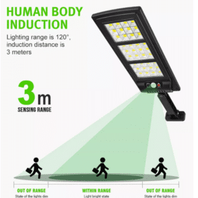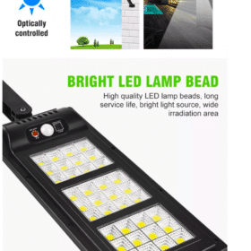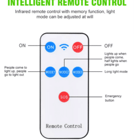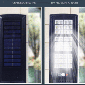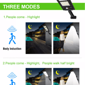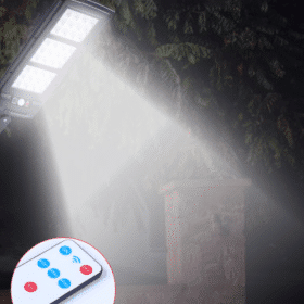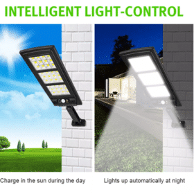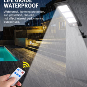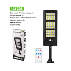 Vægmonterede fjernbetjent solcellebelysning med stort solpanel og 144 små LED-enheder, en lysstyrke på 2500 lumen, og en spredning på hele 120° i et kraftig, vandtæt design med intelligent lys- og bevægelsessensor. Praktisk solcelledrevet udebelysning der kan oplyse din have, indkørsel, baggård eller hvor nu lys og ekstra sikkerhed kunne ønskes.