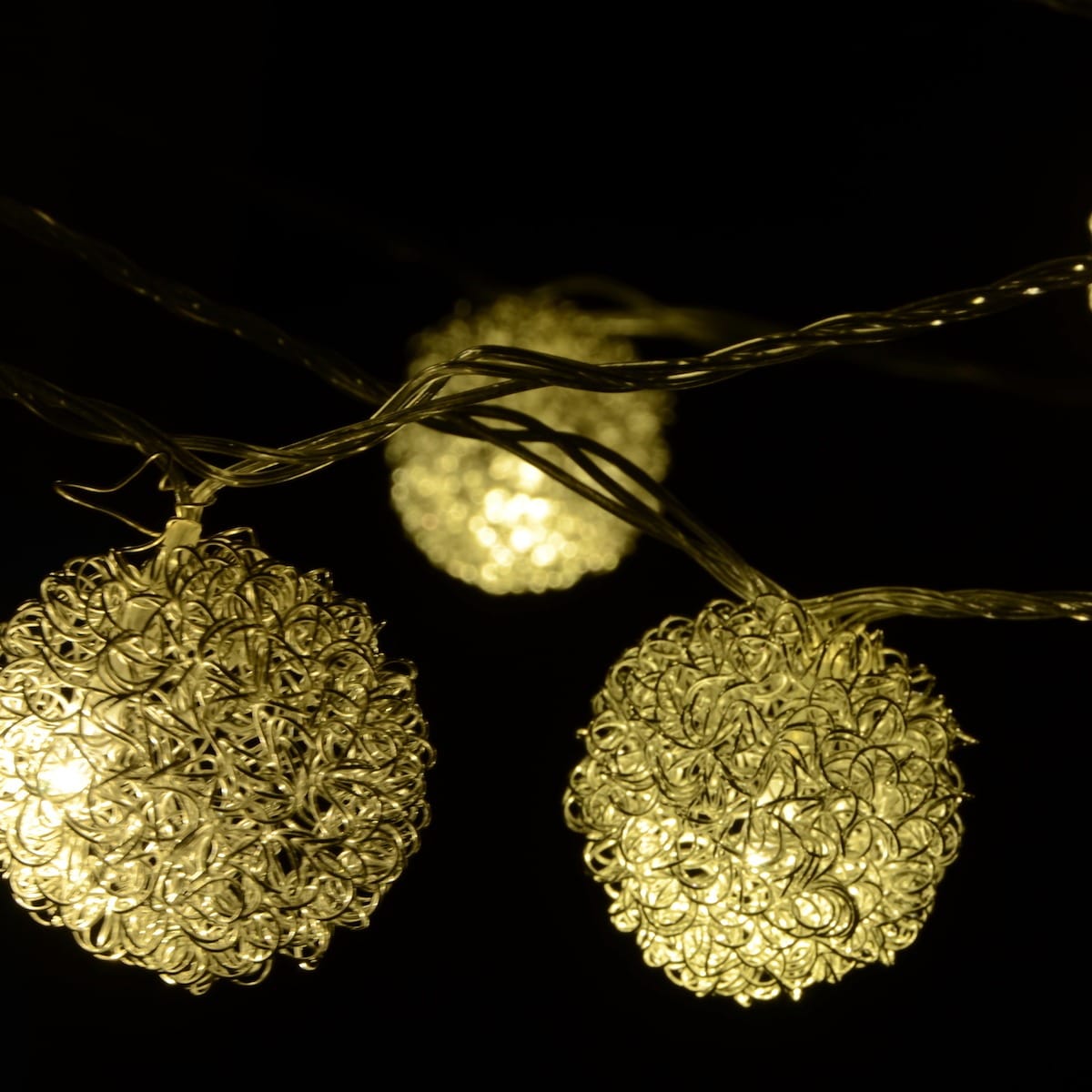 Denne LED-lyskæde kugler kan bruges mange steder, hæng den på væggen, læg den som en del af en smuk dekoration på et fad eller i en glasvase, over billeder, på juletræet i december eller som en del af hyggen til havefesten i juli - ja mulighederne er mange og kæden giver den helt rette hygge-stemning. Hver guldkugle måler 2 centimeter i diameter og er placeret med et mellemrum på 20 centimeter mellem hver kugle.