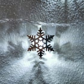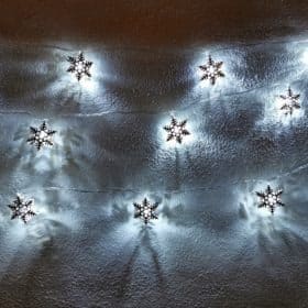 Denne LED-lyskæde smukt dekoreret der med sine Ø4 cm. flotte snefnug kan bruges mange steder, hæng den på væggen, læg den som en del af en smuk dekoration på et fad eller i en glasvase, over billeder, på juletræet – ja mulighederne er mange og kæden giver den helt rette hygge-stemning.