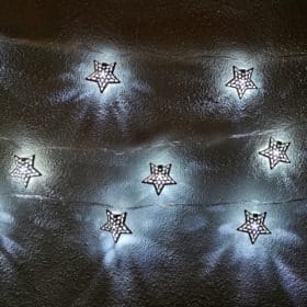 Denne LED-lyskæde smukt dekoreret med flotte sølv stjerner kan bruges mange steder, hæng den på væggen, læg den som en del af en smuk dekoration på et fad eller i en glasvase, over billeder, på juletræet i december eller som en del af hyggen til havefesten i juli – ja mulighederne er mange og kæden giver den helt rette hygge-stemning.