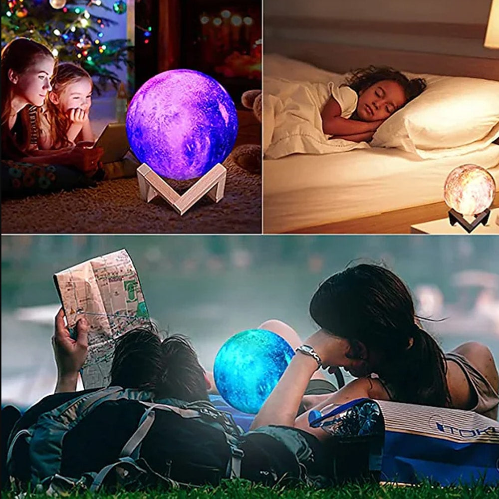 Lampen hviler på en flot og dekorativ holder af lys træ. Månelampen er genopladelig og har en batteritid på op til 20 timer, afhængig af lampens lysstyrke. Ved opladning oplades lampen nemt via det medfølgende USB-kabel.