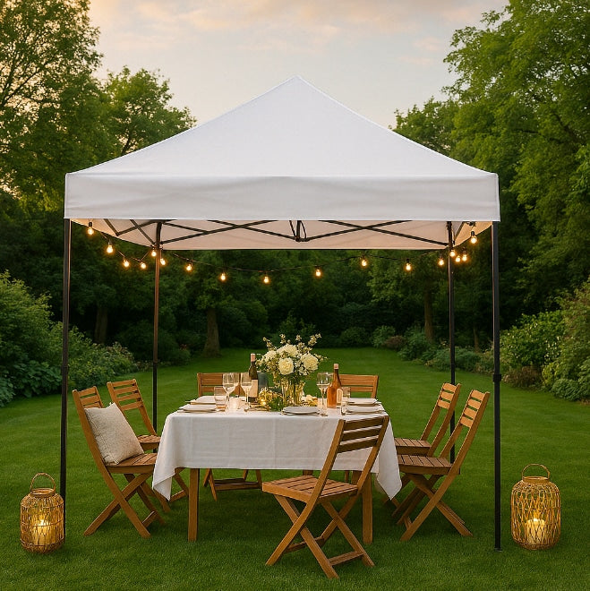 Forestil dig en sommeraften under en smuk pavillon – dækket bord, bløde puder og lyskæder, der kaster et varmt skær. Uanset om det er til havefest, fødselsdag, middag med vennerne eller en rolig stund ved havet, så giver denne pavillon dig den perfekte ramme.