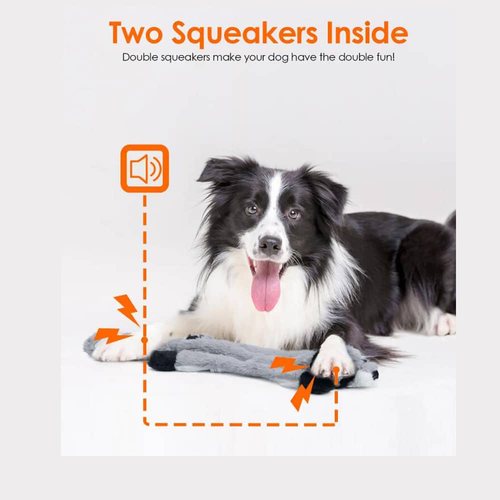 Legetøjet har to indbyggede squeakere – én i hovedet og én i halen – der piber, når de berøres. Dette gør legetøjet ekstra sjovt og stimulerer din hunds jagtinstinkt, hvilket hjælper med at reducere kedsomhed og angst, især når din hund er alene hjemme.