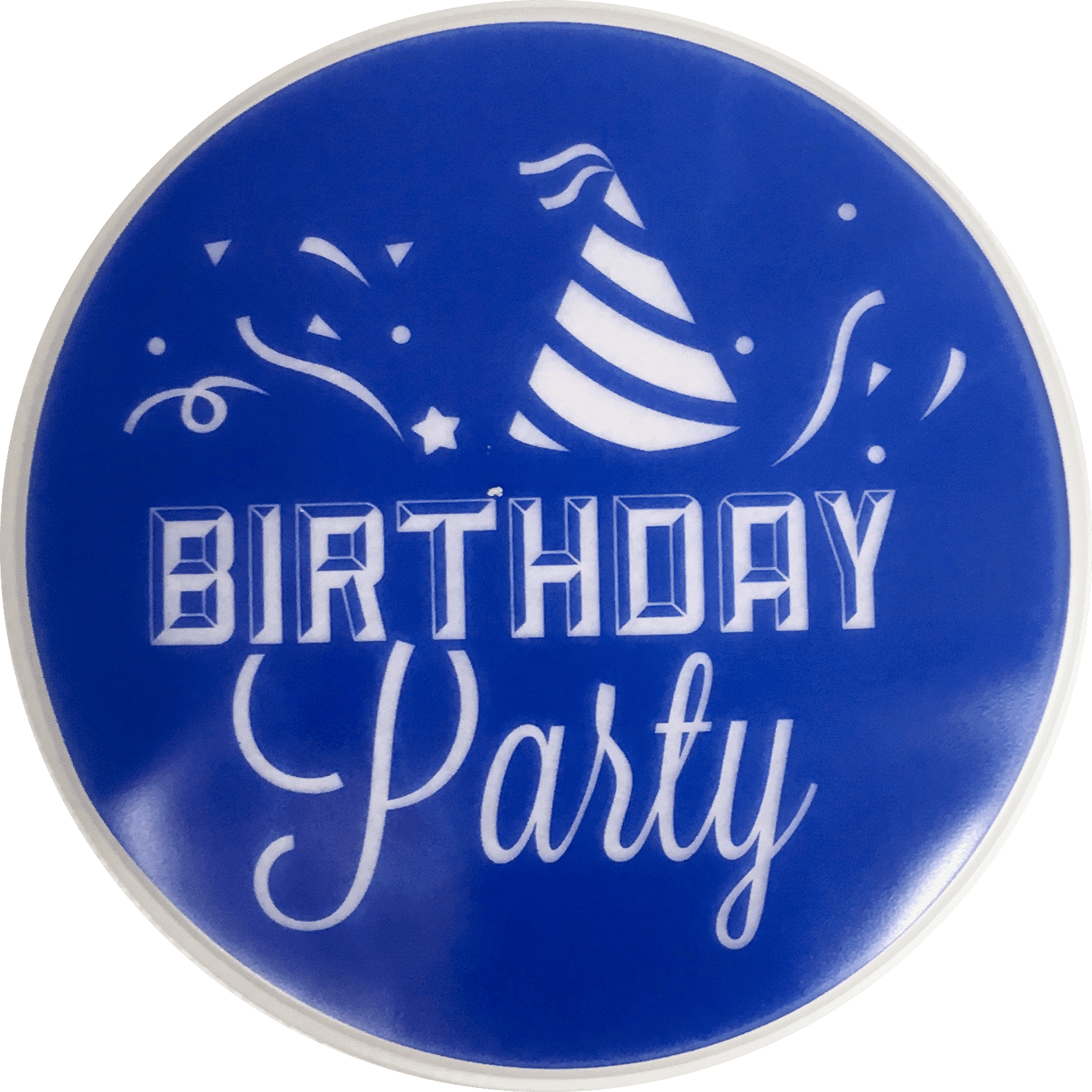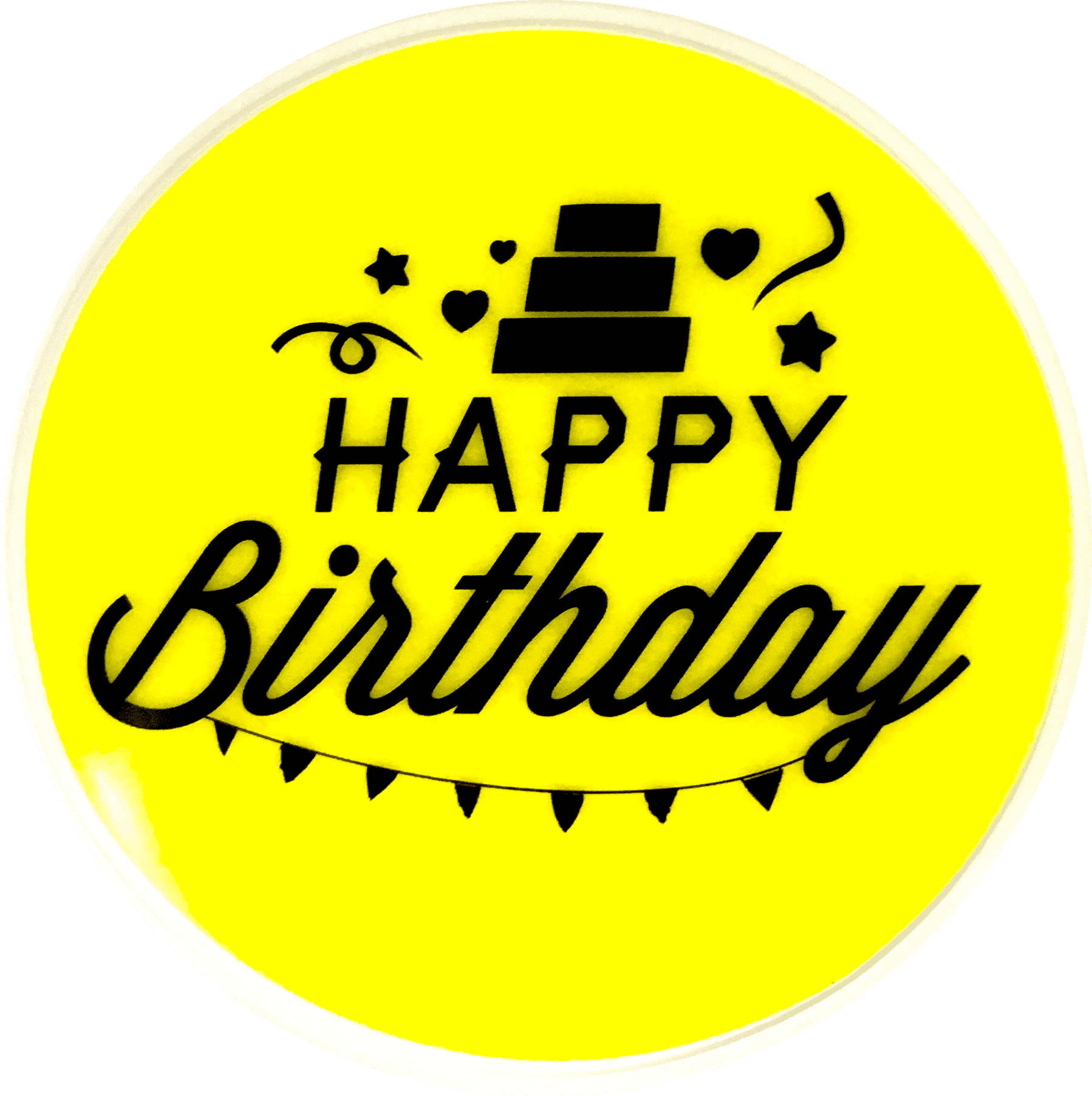 - Tekst varianter rundt klistermærke: Birthday Party, Happy Birthday Pink, Happy Birthday Gul