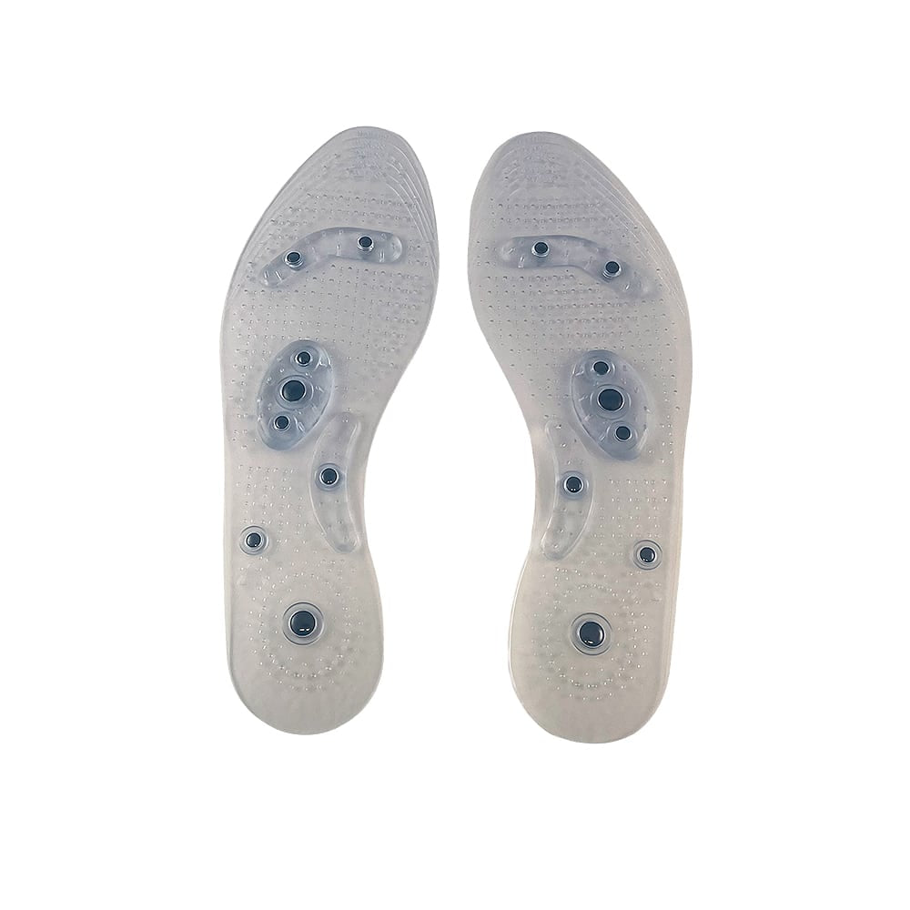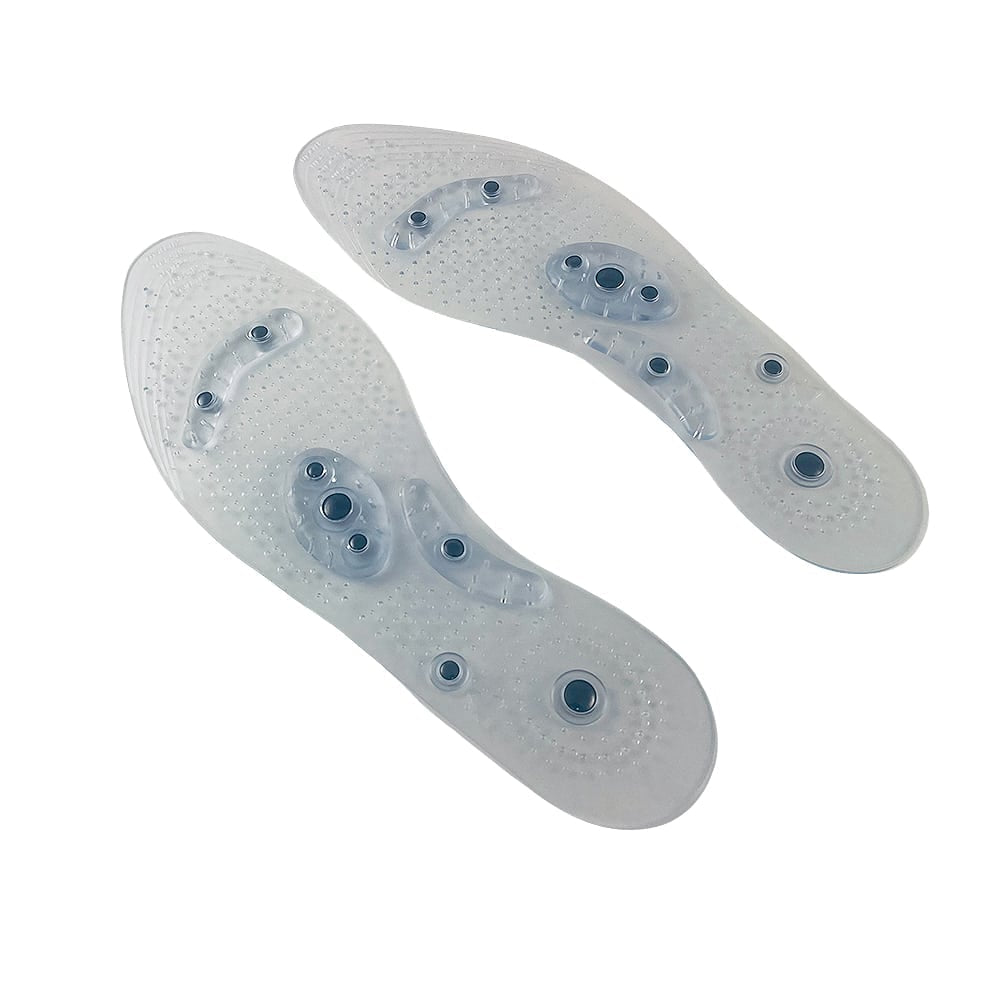 Skoindlæg/akupunktur såler produceret i blødt termoplastisk gummi og med 8 strategisk placerede magneter som er designet til at stimulere fodens akupunkturpunkter når du går og står, for øget velvære i såvel fødder og underben. Sålerne klippes til efter skoens eksisterende såler, kan tørres med en fugtig klud og herefter lufttørres. Tåler ikke direkte sollys.