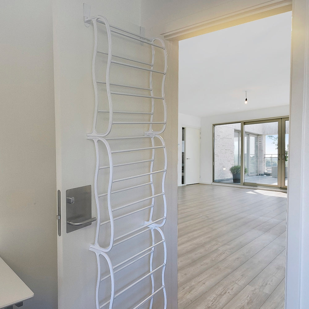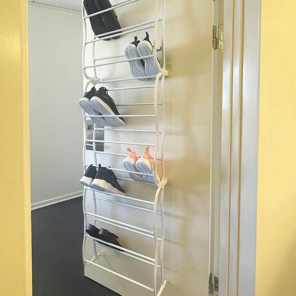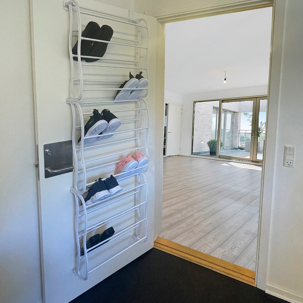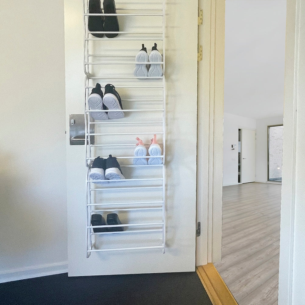 Skoreolen består af 12 hylder, men optager minimalt, da den blot ophænges på indersiden af en dør eller på en væg. Den skal blot hænges på døren, men så har du en både nem og praktisk løsning til opbevaring af sko.