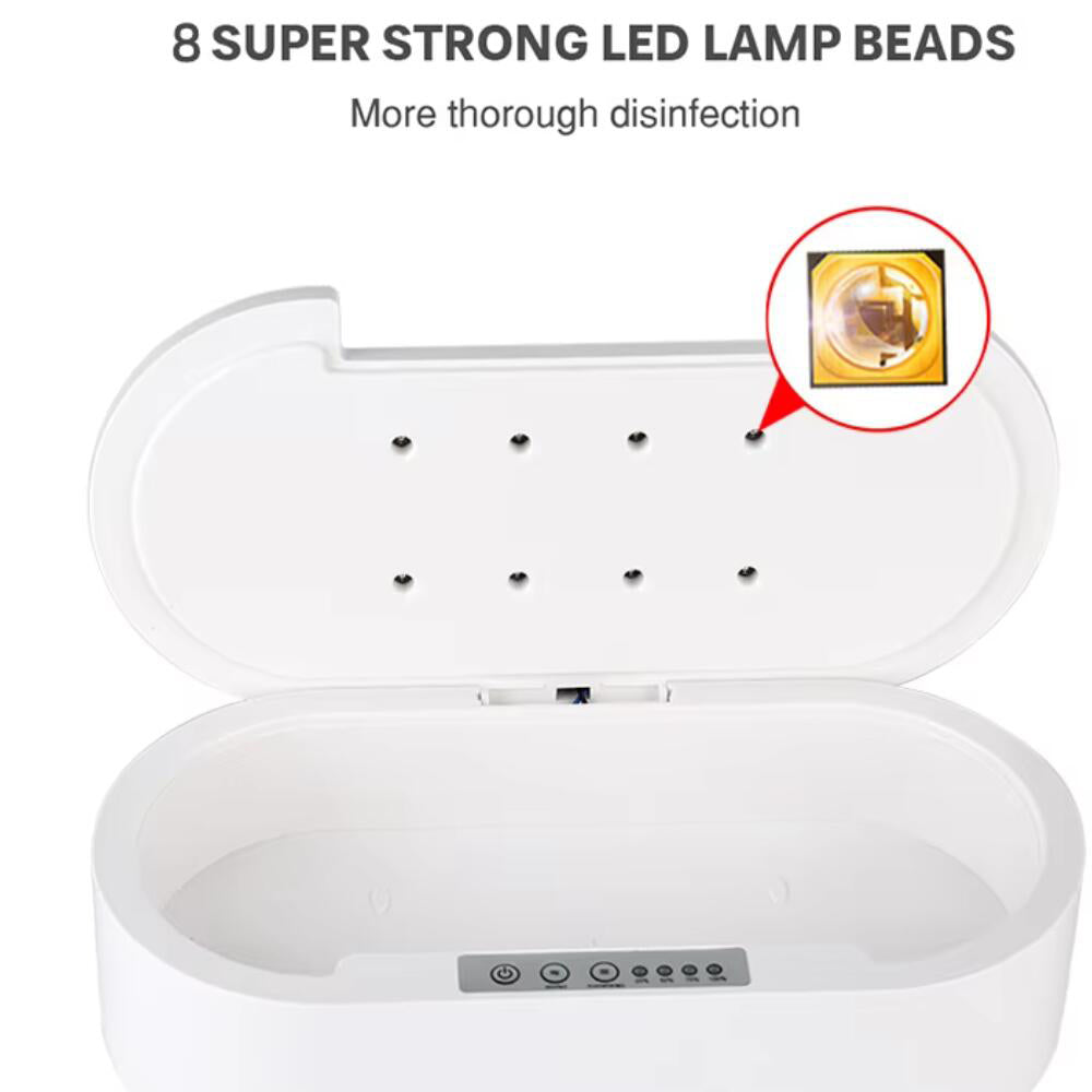 Denne smykke- og brillerenser anvender avanceret UV-C LED-teknologi til effektivt at eliminere bakterier og vira på dine personlige ejendele. De otte kraftige LED-lyskilder udsender UV-C lys med en bølgelængde på 260-280 nm, som ødelægger mikroorganismers DNA og RNA, hvilket sikrer op til 99,9 % desinfektion.