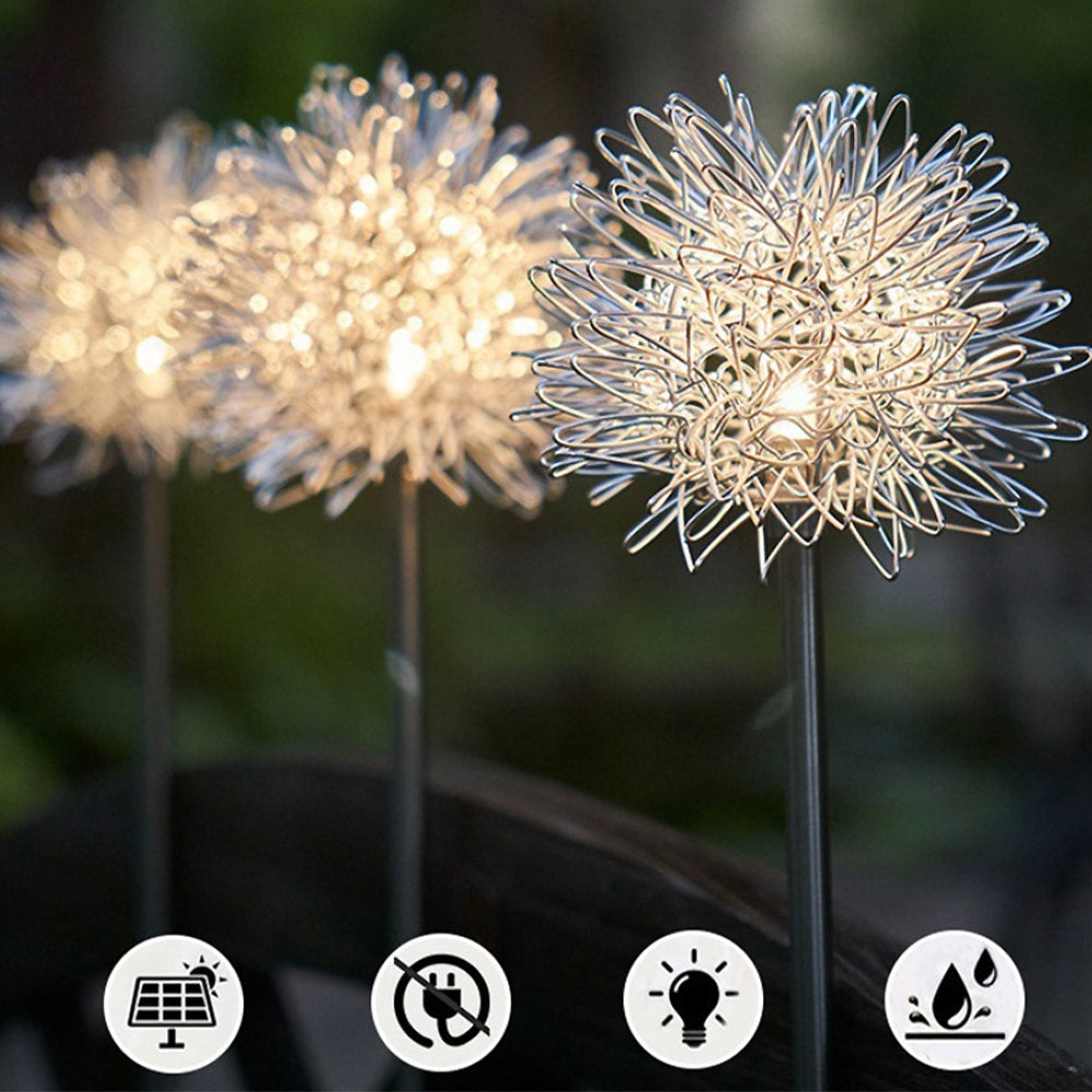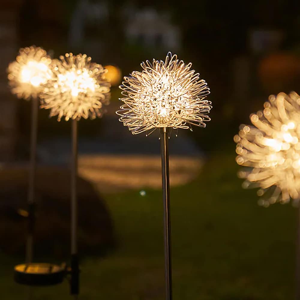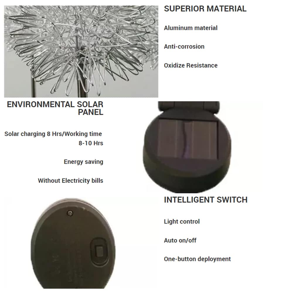 Her slipper du for at tilslutte klodsede ledninger til en stikkontakt. Takket være solcellepanelet der er fastmonteret midt på havelampens spyd og det stærke batteri (NI-MH AAA 1.2V/300 mA), klarer lysene nemlig sig selv. Hver lampe er formet som en smuk mælkebøtte med LED-lys i midten.