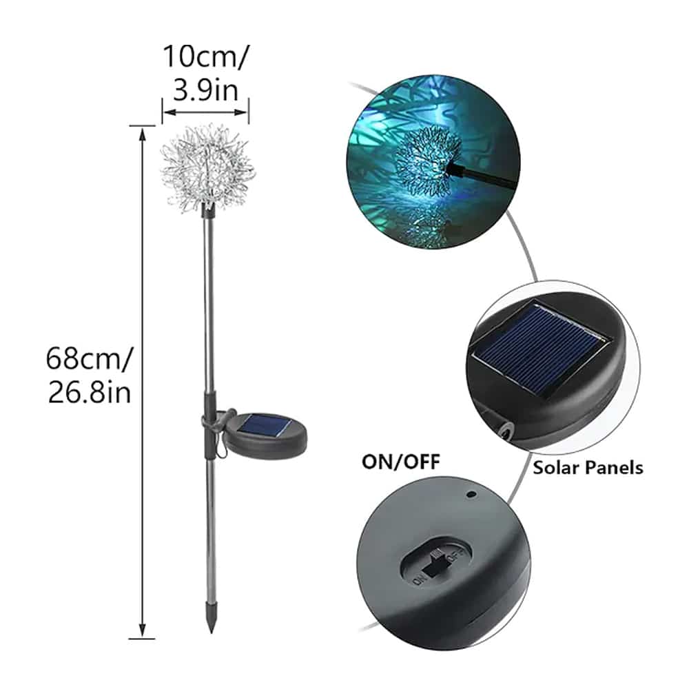 Du får her 2 smukke solcellelamper dekoreret med mælkebøtter, der lyser med et varmt hvidt lys. Perfekt til havedekorationer og med til at skabe en hyggelig atmosfære. Lamperne er drevet af solenergi, som omdanner solens stråler til elektricitet og tænder automatisk når det bliver mørkt.