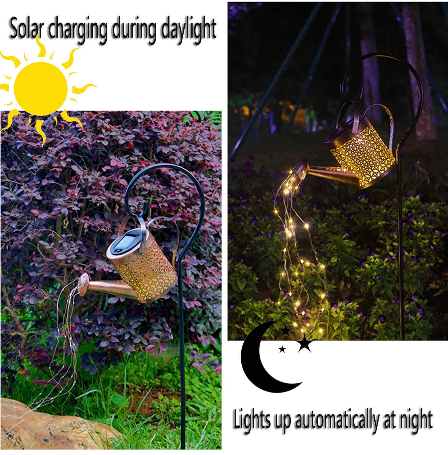 Ud fra vandkandens tud kommer der 6 LED lyskæder, der giver en flot effekt af strømmende vand, specielt hvis der er en lille smule vind. . På oversiden af kanden er der anbragt et solcellemodul.