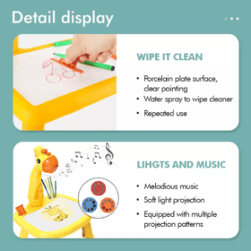 Vores lille, smarte projektorbord finder den lille maler/kunstner frem i dine børn og giver en sjov og lærrig underholdning, simpelthen en god måde at lære at tegne og farvelægge. Projektorbordet har 4 aftagelige støtteben, 24 forskellige farvelægningsbilleder, sletbar tavle og 12 tusser og 1 viskelæder medfølger.