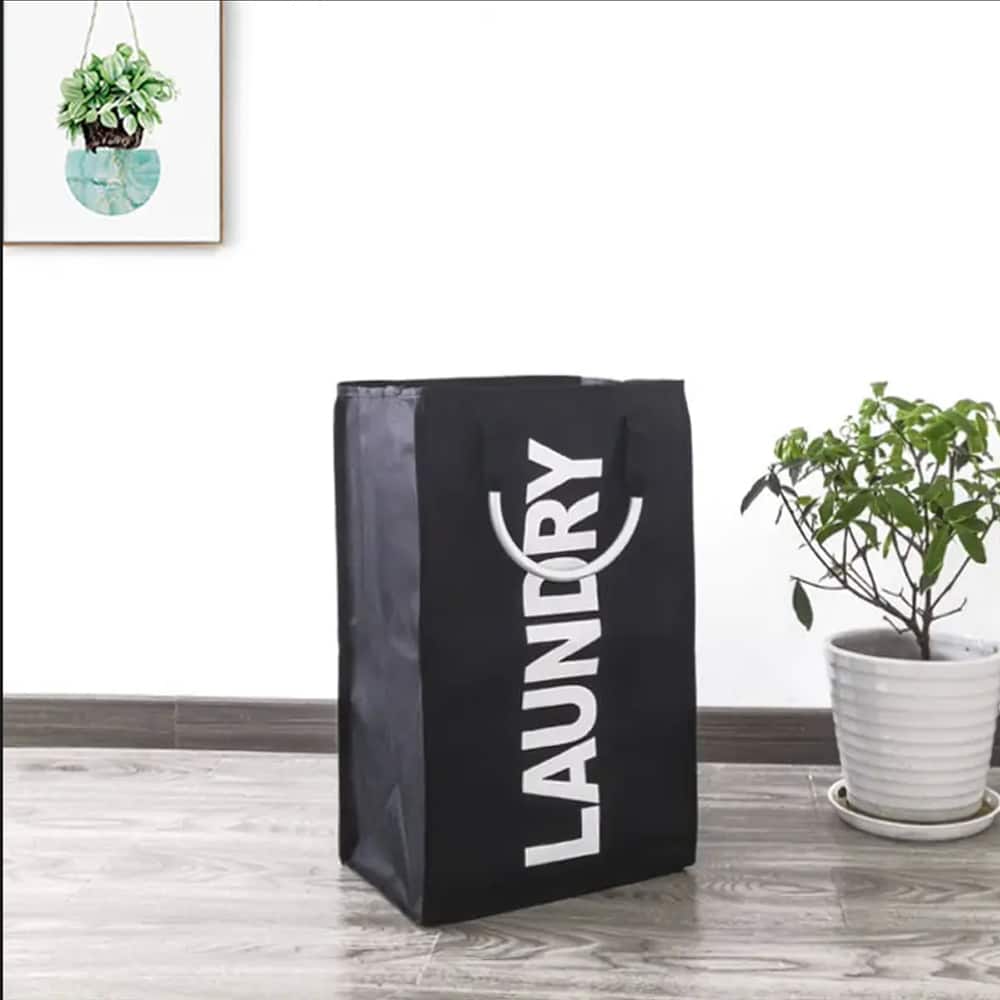 Kompakt og foldbar vasketøjskurv med den trendy tekst "LAUNDRY" der der helt sikkert vil pynte på børneværelset eller i soveværelset, fremstillet i flot og stærkt tekstil, i farverne sort, grå eller lysegrå.