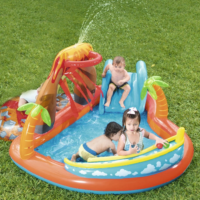 Bassinet er fremstillet af robust for-prøvet vinyl og kan indeholde op til 208 liter. Pakken inkluderer pool med palmer, en aftagelig rutsjebane, lava tunnel, 4 bolde, 1 oppustelig ring og en reparationslap. En del af pool gulvet kan pustes op og fungerer som en pude på rutsjebanen.