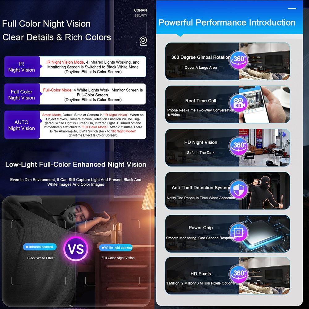 Det eksklusive kamera indeholder den mest moderne teknologi til hjemme- eller arbejdspladsovervågning. Det er ideelt til at overvåge børn, kæledyr eller blot forøge din følelse af tryghed under ferien. Kameraet er udstyret med en 360° pan-tilt funktion, fire IR-infrarøde lyskilder for nattesyn, fire LED-lys, der aktiveres ved bevægelsesdetektion i rummet, samt en imponerende opløsning på tre millioner pixel. Ydermere inkluderer det en indbygget mikrofon og højttaler til tovejskommunikation.